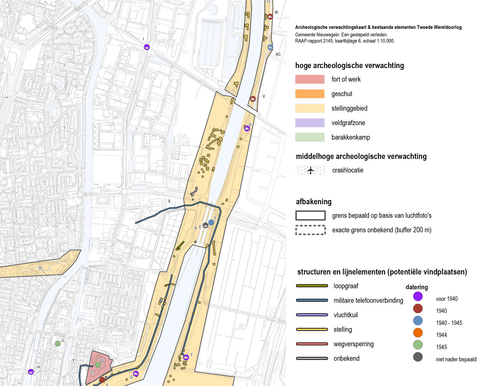 Op de archeologische verwachtingskaart voor de Tweede Wereldoorlog staan verschillende zones aangegeven met een hoge verwachting voor resten uit de oorlog. Daarbij is onderscheid gemaakt in verschillende categorieën, zoals forten en zones met stellingen. Voor zover mogelijk zijn binnen deze zones de afzonderlijk objecten en structuren aangegeven, zoals loopgraven en stellingen. Voor de afzonderlijke objecten is een zo specifiek mogelijke datering gegeven. De getoonde kaart toont een uitsnede uit deze verwachtingskaart.